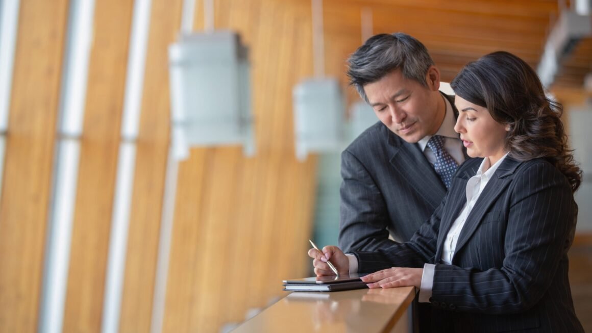 Two bank executives in a discussion while looking at a tablet on a desk