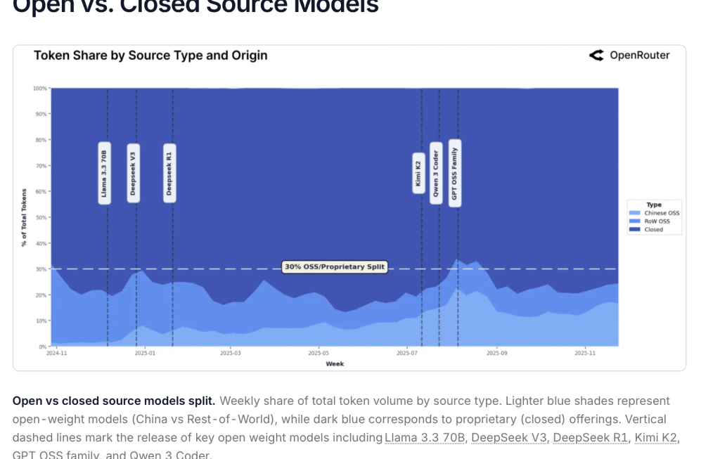 Another major revelation: Chinese AI models now account for approximately 30% of global usage—nearly triple their 13% share at the start of 2025.