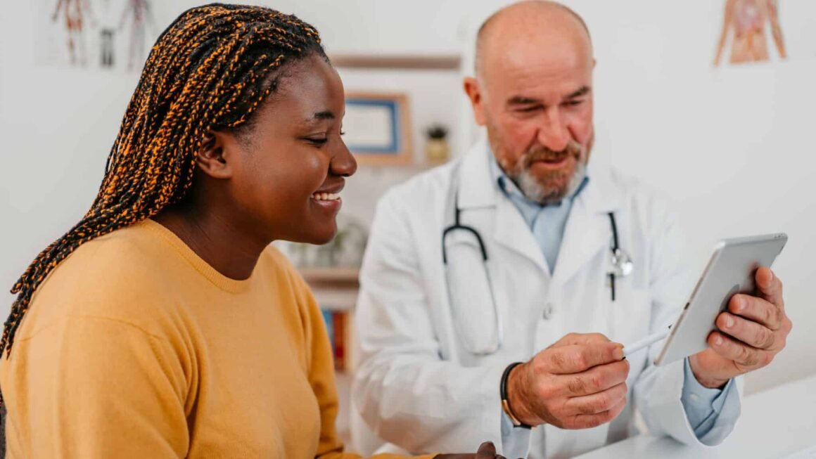 A doctor and a patient in discussion while looking at a tablet