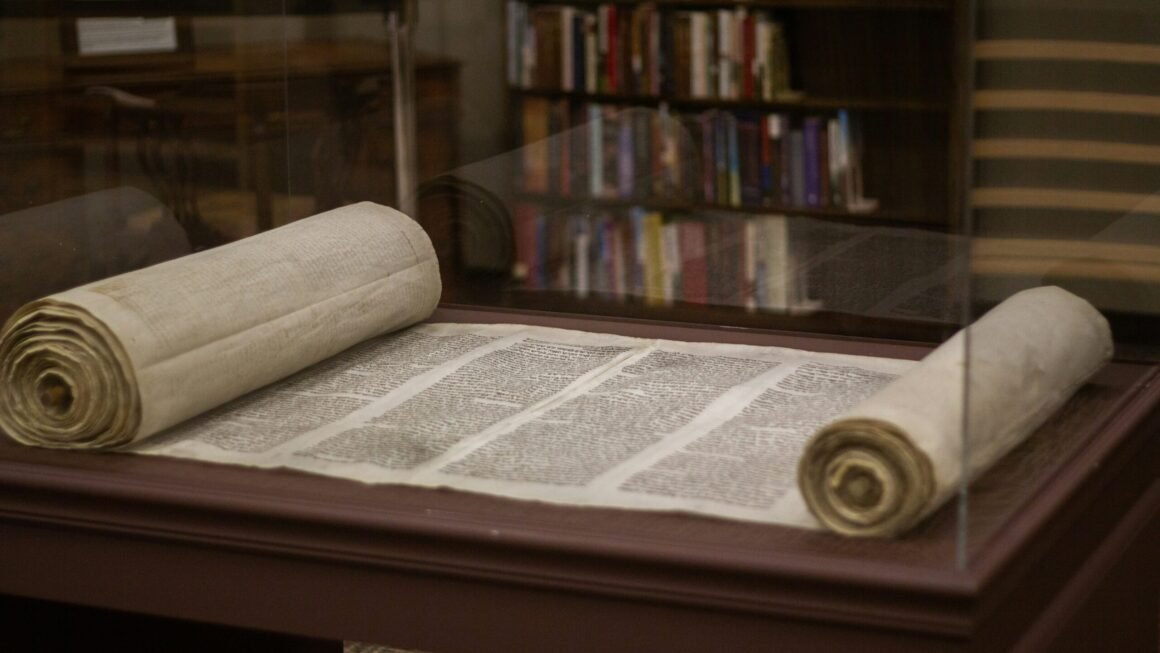 Photo of an ancient scroll partially unrolled inside a glass case on a wooden desk.